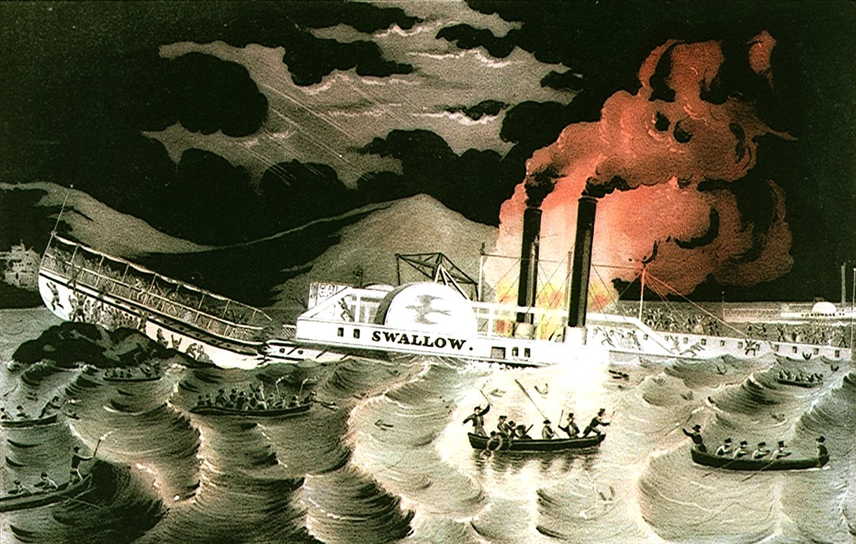 Conkling was aboard The Swallow for an overnight trip down the Hudson River from Albany to New York City on April 7, 1845. As was typical for the times, steamboats coursing the Hudson River often raced each other - legally, if not responsibly. The Swallow was just ahead of two other steamers on that blustery, snowy night, when, about two hours into the trip, the ship struck a rock outcropping near the shore in Athens. The force of the impact was so great her bow rose 15' over the rocks and she nearly split in two. The portion of the boat still above water was quickly ablaze from the damaged boilers while the stern sank.