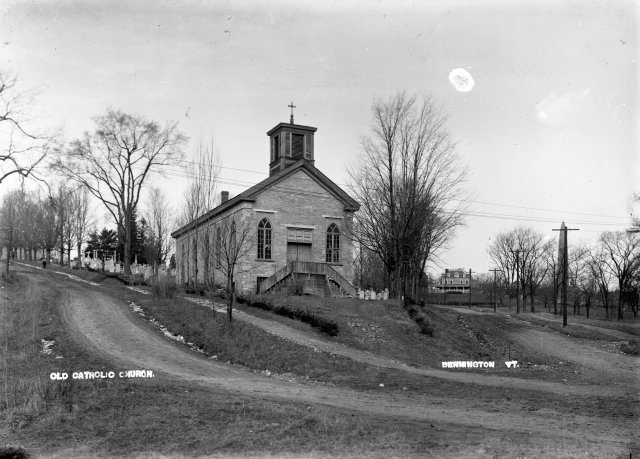 Due to the rapid growth of population in the lower village, which surpassed the hill community about that time, the road down Town Hill was opened in 1841. "East Bennington" and Old Bennington were involved in a bitter rivalry over the location of the post office, since in those days one walked to the post office to pick up the mail. In the fall of 1846 the courthouse (the second one, still on the hill near where the Monument is today) burned, and the efforts of the residents of the lower village to have it rebuilt down-the-hill increased the bad feelings. The legislature gave the honor to the hill dwellers,so the new building was built in what today is part of the cemetery, just north of the Old First Church. The land was purchased from the Squier family by the County of Bennington. By that time, Truman Squier had passed away, and the old farmhouse had become a tin shop, as can be seen in a classic photograph of the time. The present county courthouse on South Street is a copy of the previous one in the cemetery.